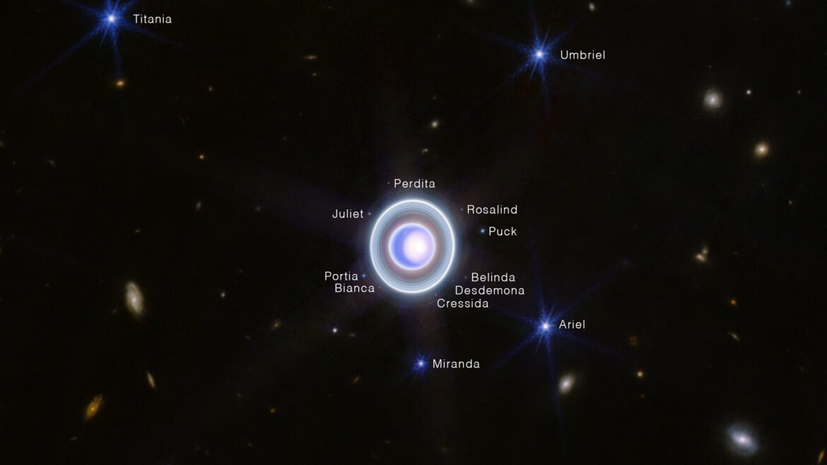 The image also captures 14 of Uranus’ 27 moons, labeled in the photo above. Among the (mostly Shakespearean-named) orbiting bodies pictured are Oberon, Titania, Umbriel, Juliet, Perdita, Rosalind, Puck, Belinda, Desdemona, Cressida, Ariel, Miranda, Bianca and Portia.