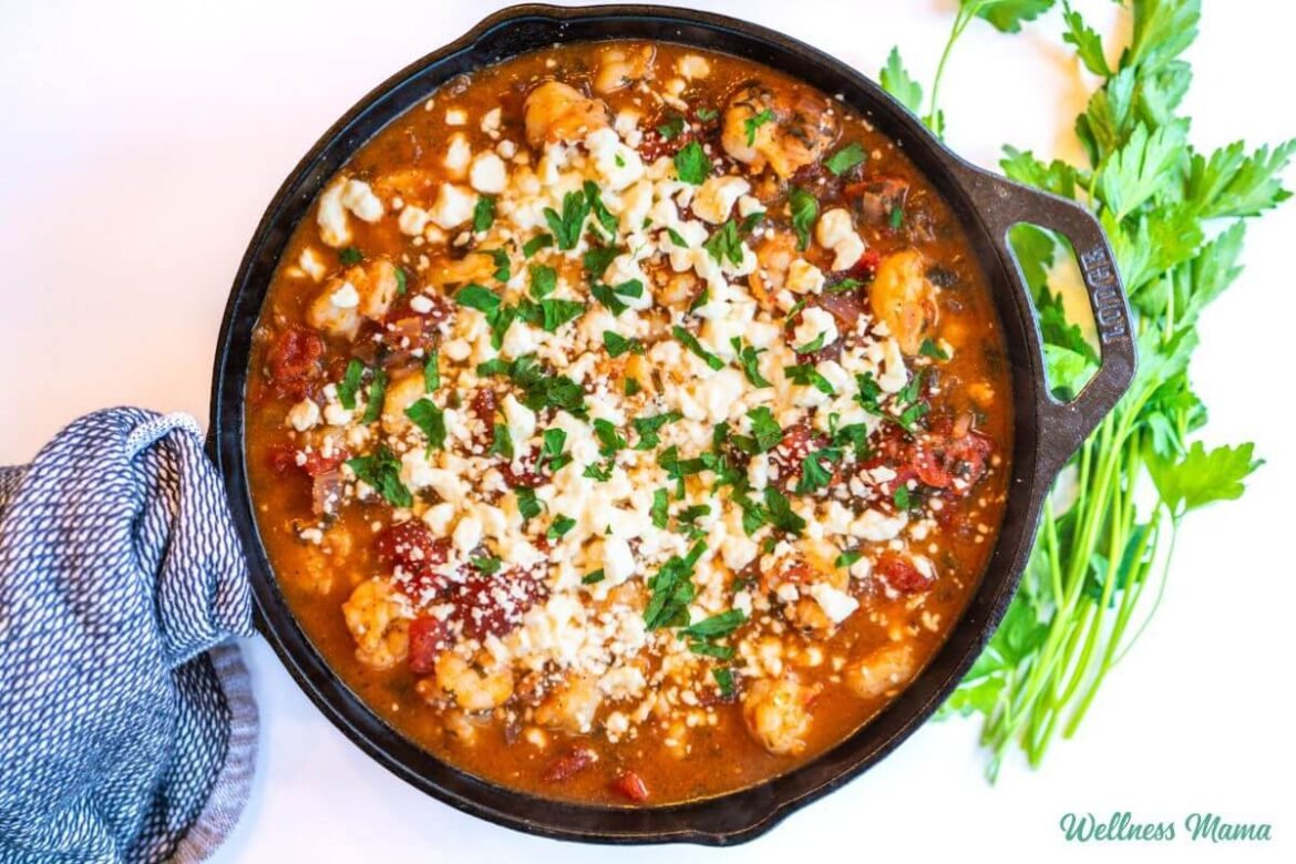 Because it’s so rich in flavor this dish tastes best served with some milder flavors. In Greece, they’ll use pita bread or crusty bread to dip in the juices. Orzo is another popular option. It’s often served as an appetizer as part of a mezze platter along with kalamata olives, dips, fresh veggies, and cheese. Sourdough bread, grain-free crackers or flatbread, or white rice are also good options.