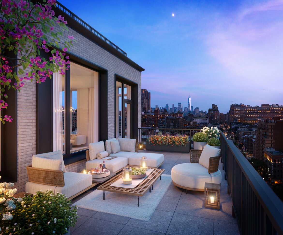 Amenities include flexible lounge and work spaces, a children’s playroom, a 24-hour attended lobby, bike storage, a state-of-the-art fitness center, and a yoga studio. Outdoor amenities include a turf for workouts, a courtyard terrace with plush seating and landscaping, and a rooftop lounge and sundeck with grills and breathtaking city views, especially of Hudson Yards.