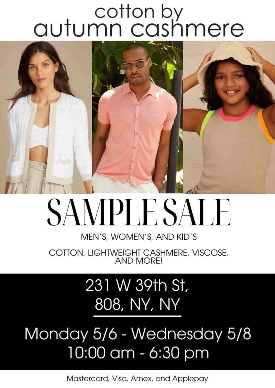 Sample & stock sale. Collections, stock and one-of-a-kind samples for men, women and kids. Cashmere, cotton and lightweight blend apparel and accessories. Stock up on spring essentials, at 50 to 75 percent off. Mastercard, Visa, American Express and cash accepted.
