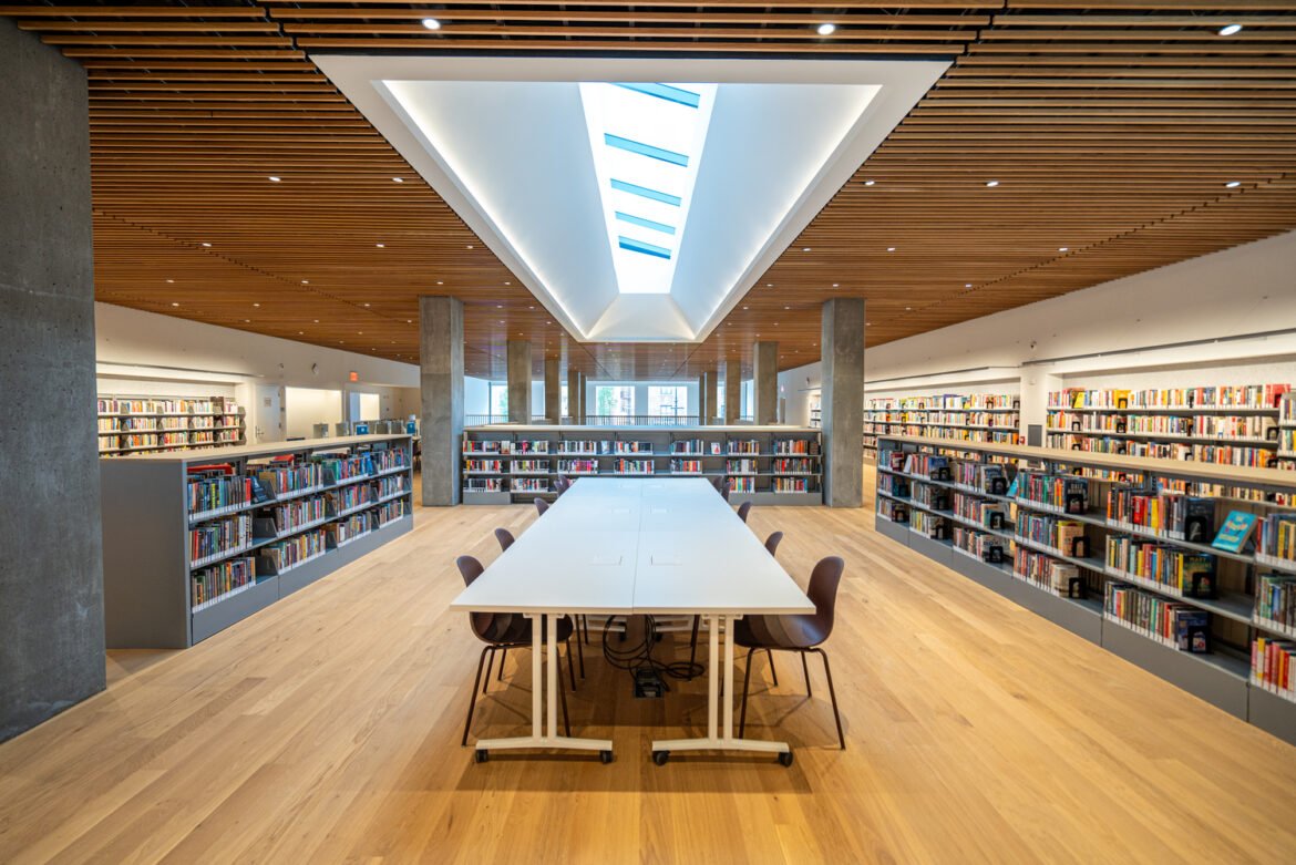 Measuring 20,000 square feet, the library retains its previously offered services, including literacy programs and story times. The library’s open and flexible floor plan makes space for computer classes, a community room, co-working spaces, and quiet reading spaces.