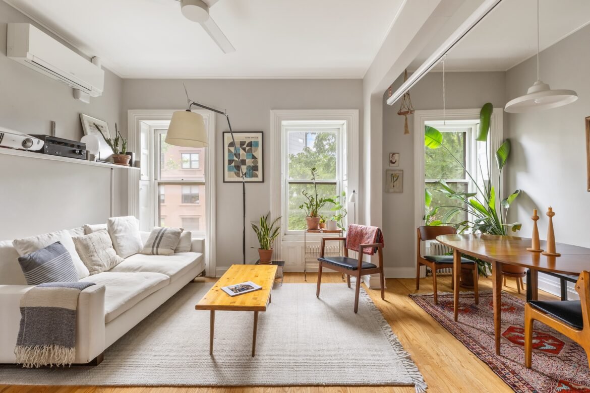 Asking $1,375,000, this two-bedroom co-op at 144 Park Place at the border between Park Slope and Prospect Heights is a sunny top-floor home with a fresh renovation, clean lines, and inspiring city views. But the full-floor walk-up (it’s on the sixth floor but only three flights up) shows its best advantage in summertime: Just upstairs, a full private roof deck offers space for dining, gardening, and entertaining in enviable Brooklyn style.