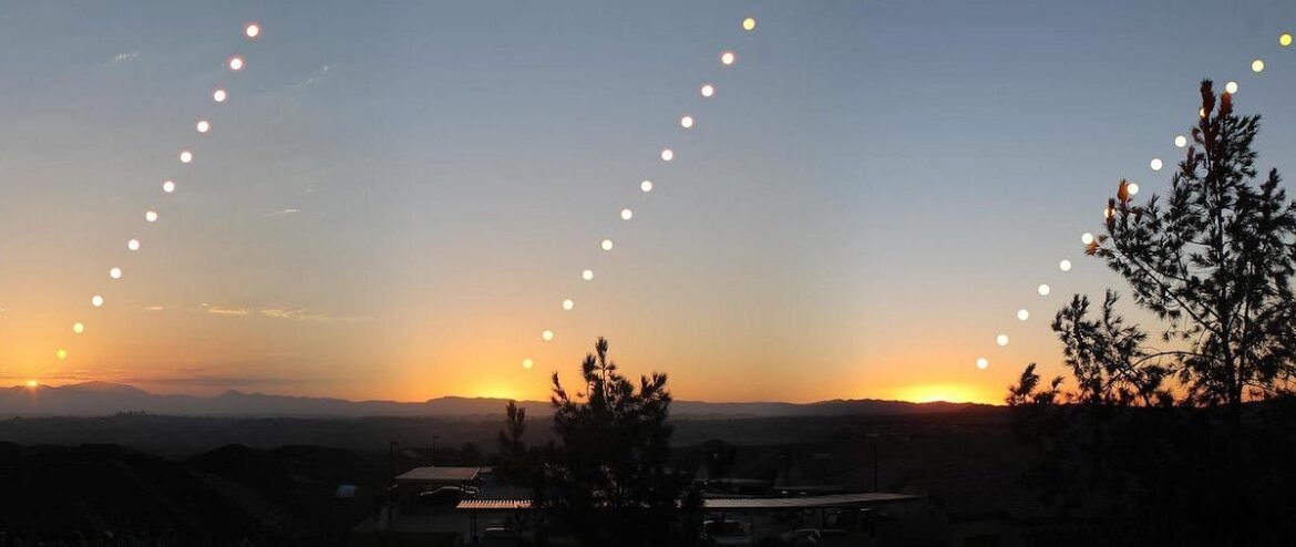 This panorama of three different sunrises: during Summer solstice (left), equinox (middle), and Winter solstice (right). Note not only the difference in the Sun’s location, but also the shape of its rising path, between the three cases. (Credit: LynceanEducation/Wikimedia Commons)