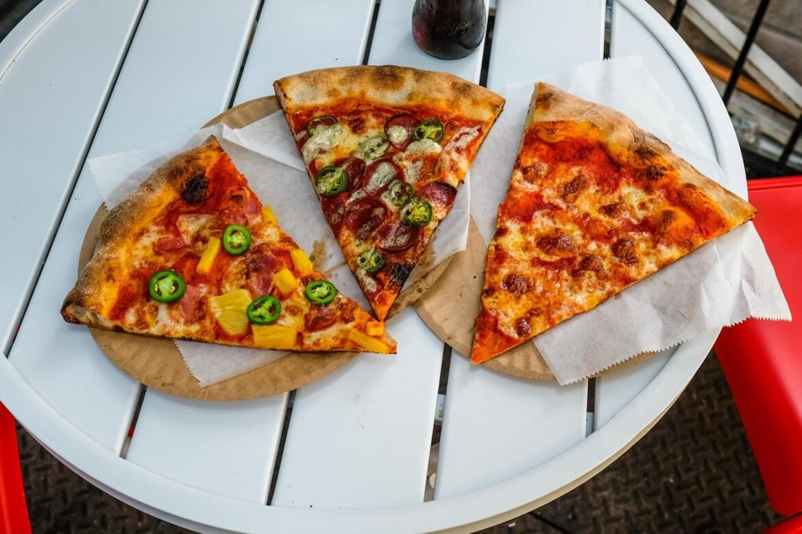 My two favorite slices at La Flor are less conventional, and maybe even a little controversial, here in Brooklyn. The “spicy Hawaiian” is loaded with fresh-cut (not canned) pineapple, thinly sliced capicola, and jalapeno. Some say fruit doesn’t belong on pizza. I say they are wrong.