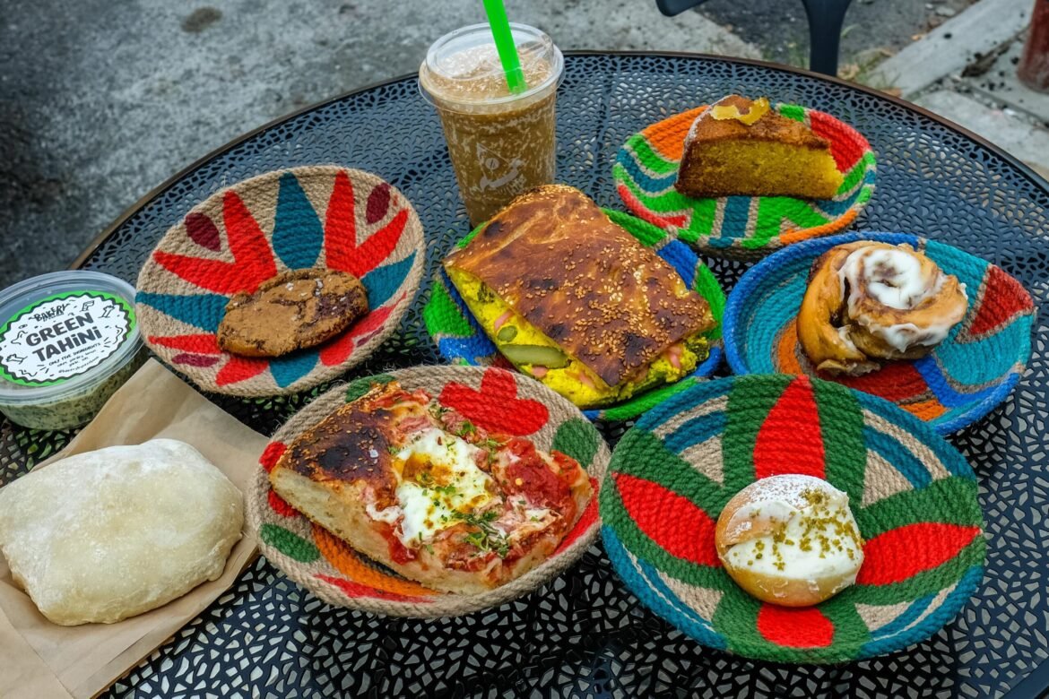 Yarema uses his focaccia for Textbook’s pizza-like shakshuka too, a Maghrebi dish he whipped up a thousand times working brunch shifts in the city but wanted to make more portable for the bakery. Other savory creations include a scone-looking pastry with kashkaval cheese, sausage and jalapeno, and a variety of sandwiches — tuna, beet pastrami, prosciutto and burrata — served on Yarema’s Persian “noon” bread, which is akin to a baguette, but even more rustic.