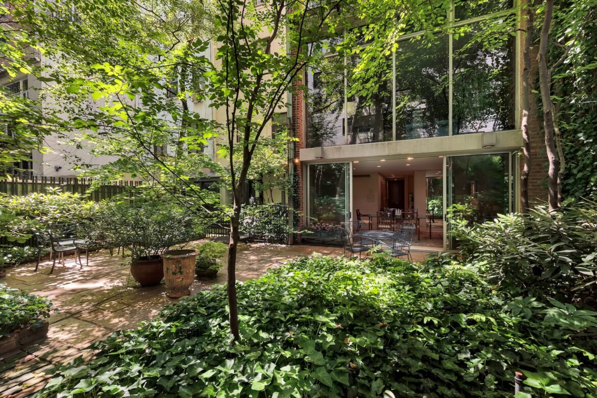 The 20-foot-wide, 6,098-square-foot townhouse is currently divided into three well-designed apartments consisting of a four-bedroom owner’s triplex, a one-bedroom duplex, and a two-bedroom duplex. All feature updated and attractive details like wood-burning fireplaces, exposed brick, high ceilings, and floor-to-ceiling windows. All units have private outdoor space, many overlooking the magical garden.
