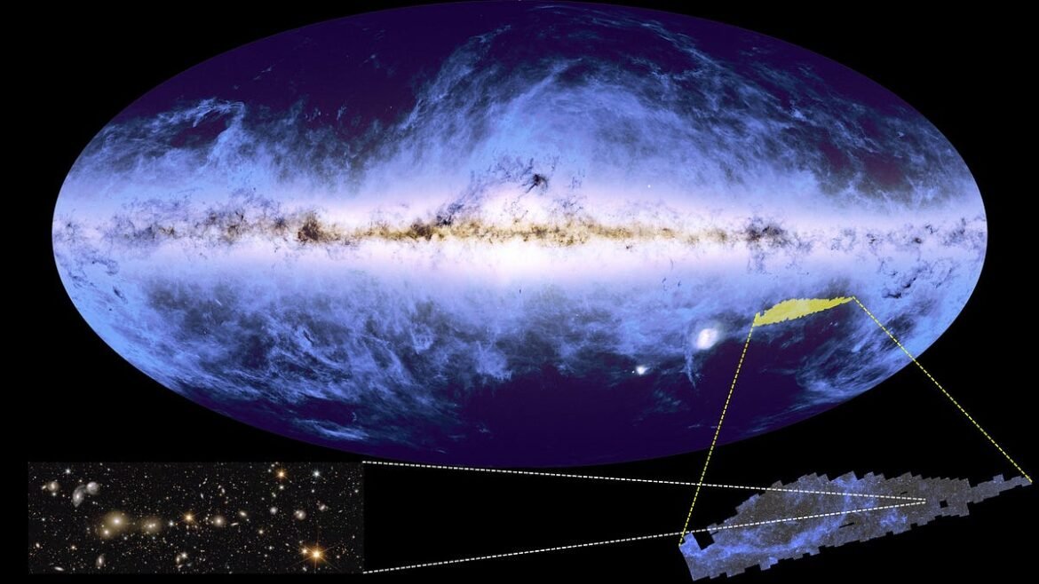 This composite map shows stars from ESA’s Gaia mission and dust from ESA’s Planck mission, together, along with the first 1% of the Euclid catalog’s data, just released, shown in yellow. A 36x zoom into the Euclid region reveals galaxy cluster Abell 3381, at lower-left. (Credit: ESA/Euclid/Euclid Consortium/NASA; ESA/Gaia/DPAC; ESA/Planck Collaboration; Processing: J.-C. Cuillandre, E. Bertin, G. Anselmi; Composition: E. Siegel)