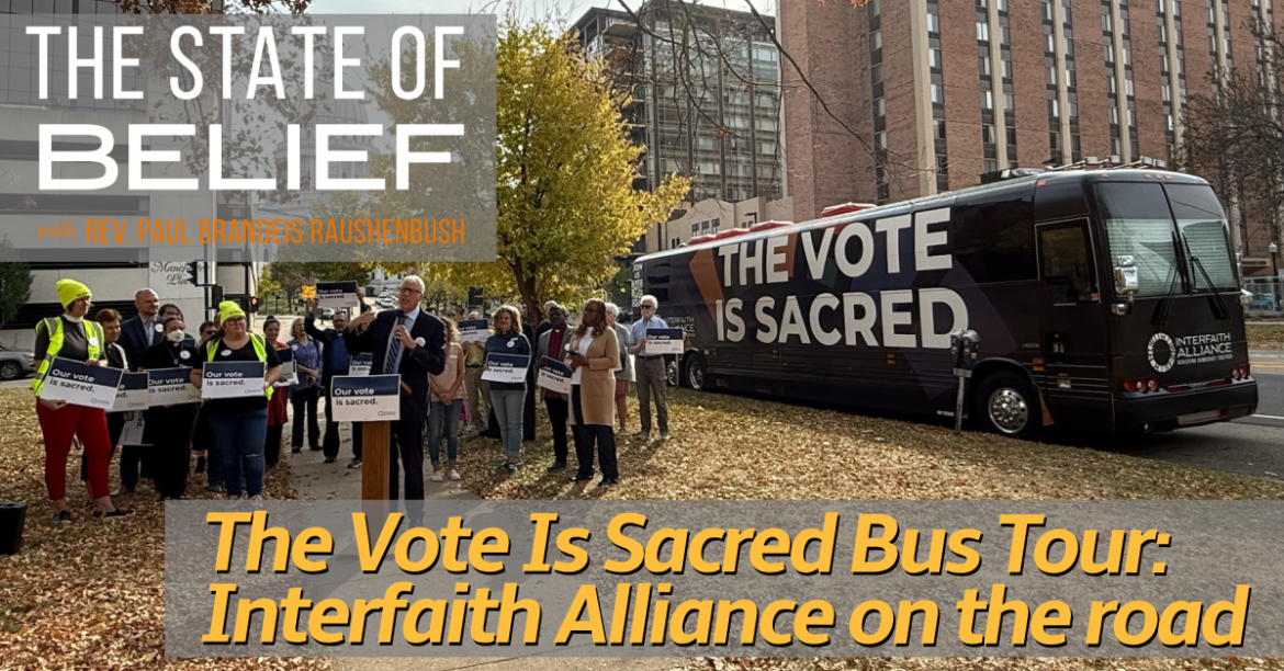 State of Belief host Rev. Paul Brandeis Raushenbush talks with faith leaders, activists and organizers along the Vote Is Sacred Bus Tour from Interfaith Alliance . . .