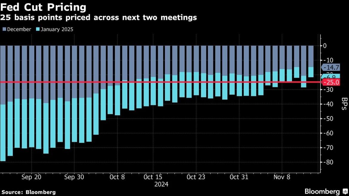 Late Friday, traders priced about a 56% chance the Fed will deliver a quarter-point reduction at its December meeting, down from 80% earlier this week. Bets on cuts were pared after Powell warned Thursday that the central bank may take its time easing policy.
