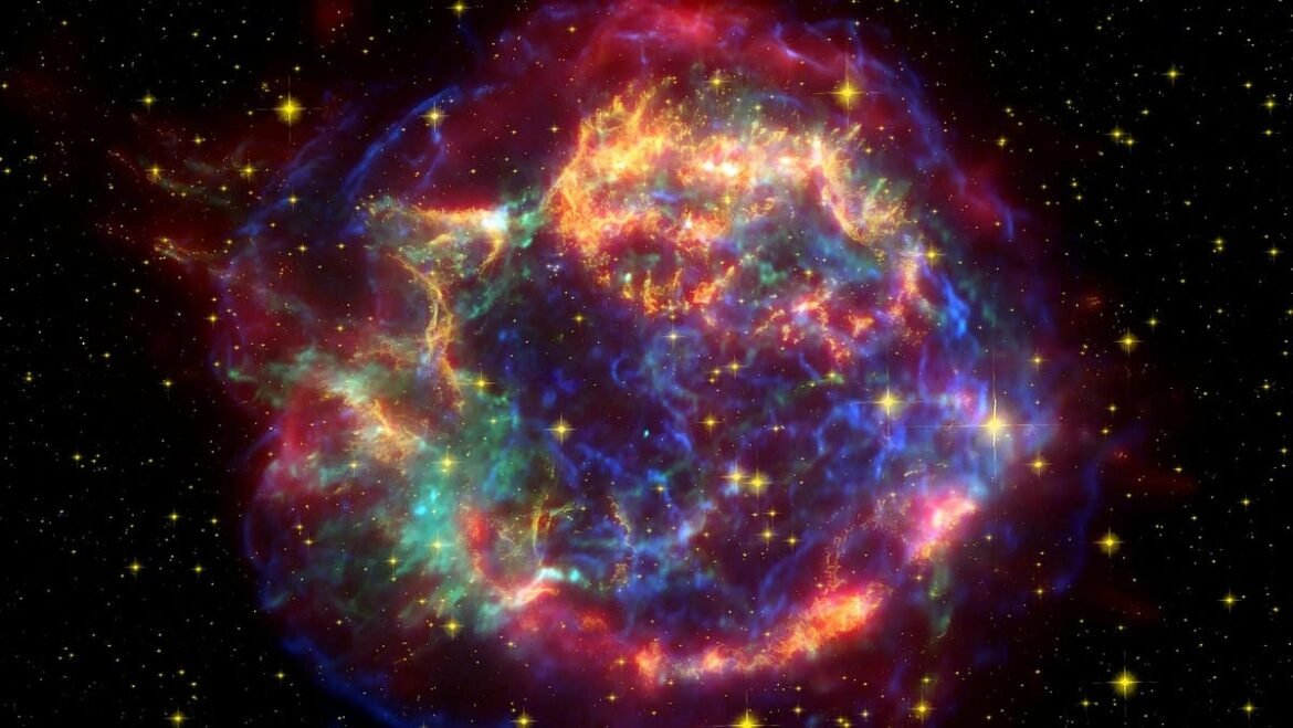 This image of the Cassiopeia A supernova remnant shows the aftermath of a type II, core-collapse supernova that occurred more than 350 years ago. The supernova remnant glows in a variety of electromagnetic wavelengths, including in various X-ray and infrared bands, with the latter shown here. The color-coding reveals the diversity of elemental signatures found within. (Credit: NASA/JPL-Caltech)