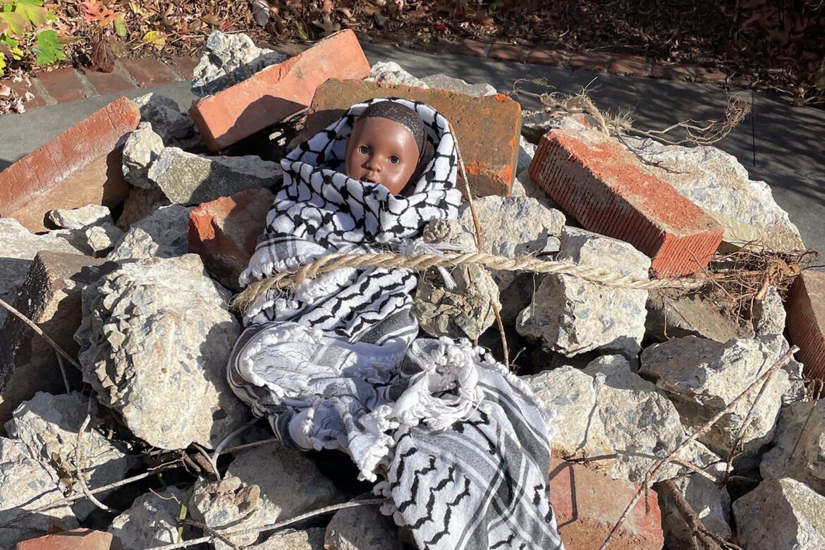 The manger has been replaced with a pile of rocks, and the baby Jesus is swaddled not with a thin blanket but with a black-and-white keffiyeh, the Middle Eastern-style scarf that has become a symbol of Palestinians’ resistance to Israeli aggression.