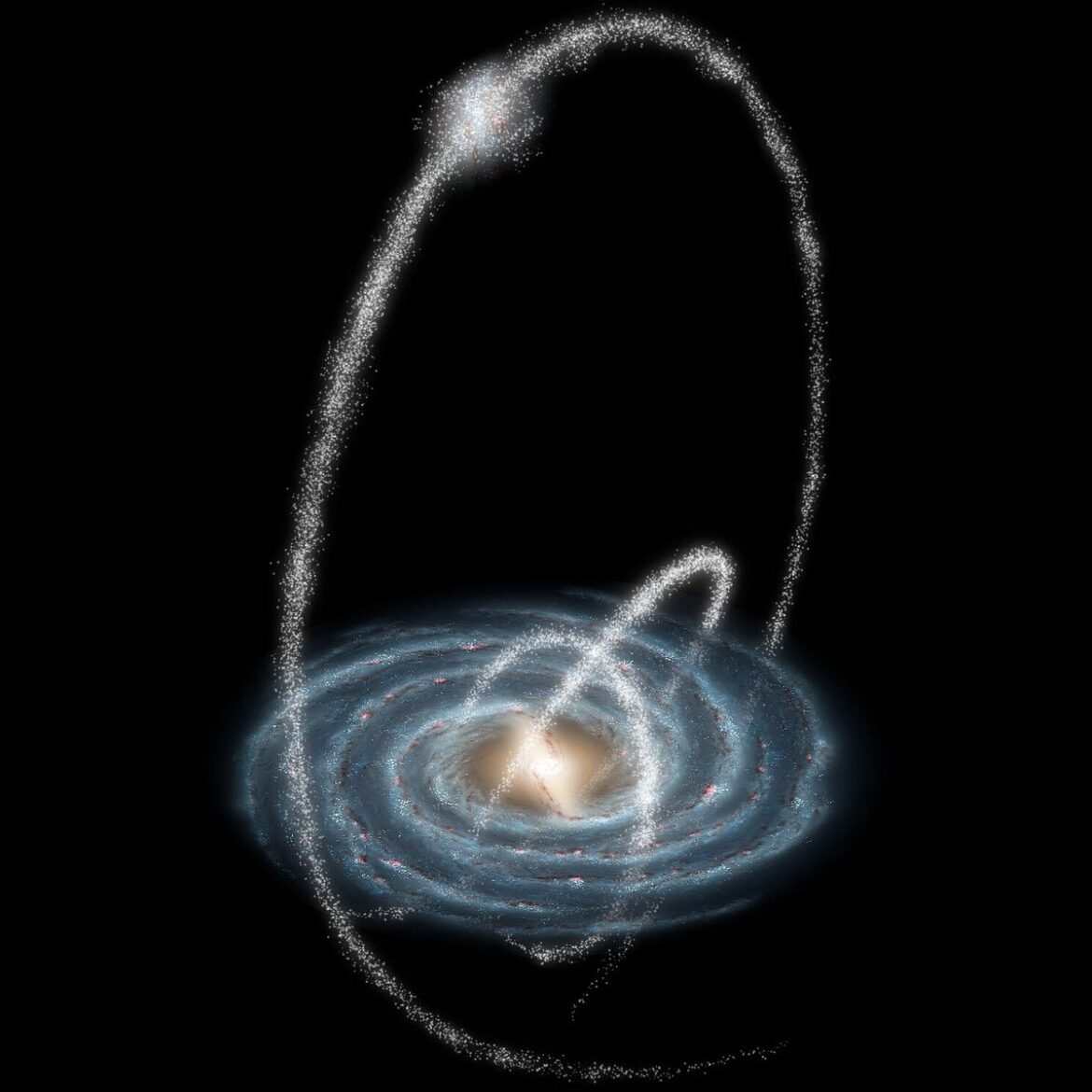 This illustration of our Milky Way shows an ancient galactic stream wrapped around our galaxy’s plane at nearly a 90 degree angle: evidence for a recent and even ongoing merger in our galaxy’s history. (Credit: NASA/JPL-Caltech/R. Hurt (SSC/Caltech))