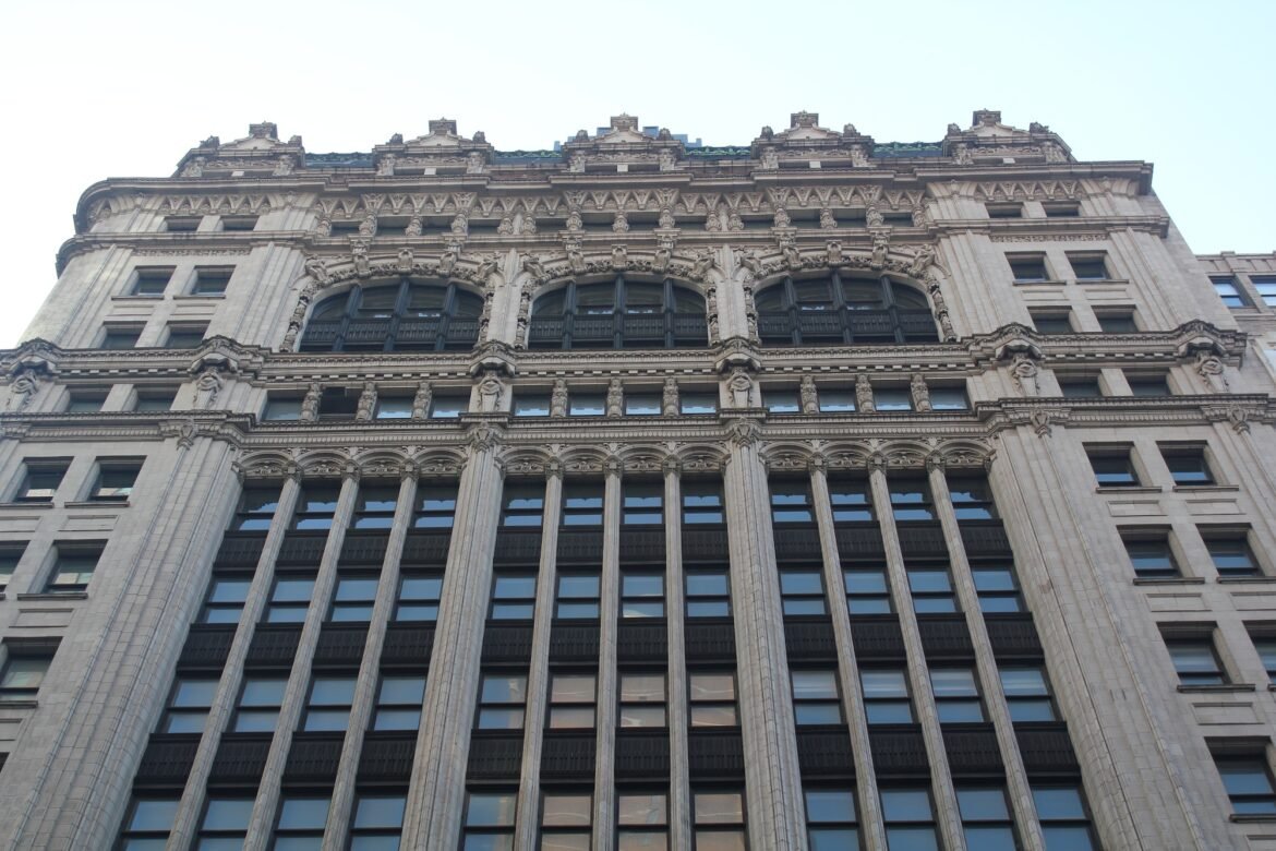 The building consists of a three-story base clad in limestone with all upper floors, projecting structures, and other decorative details faced in terra cotta. Uninterrupted pilasters that run from the fifth to 12th levels give the structure an “emphasis on verticality” that was popular in Neo-Gothic skyscraper style at the time.