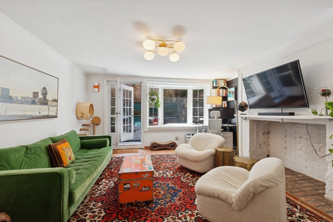 The compact kitchen offers full-sized appliances, including a dishwasher, framed by bright pop-art wallpaper. There’s also a washer and dryer in the apartment, tucked into a living room laundry closet. With spring in full bloom, it’s easy to appreciate the south-facing bluestone patio off the living room, complete with planters.