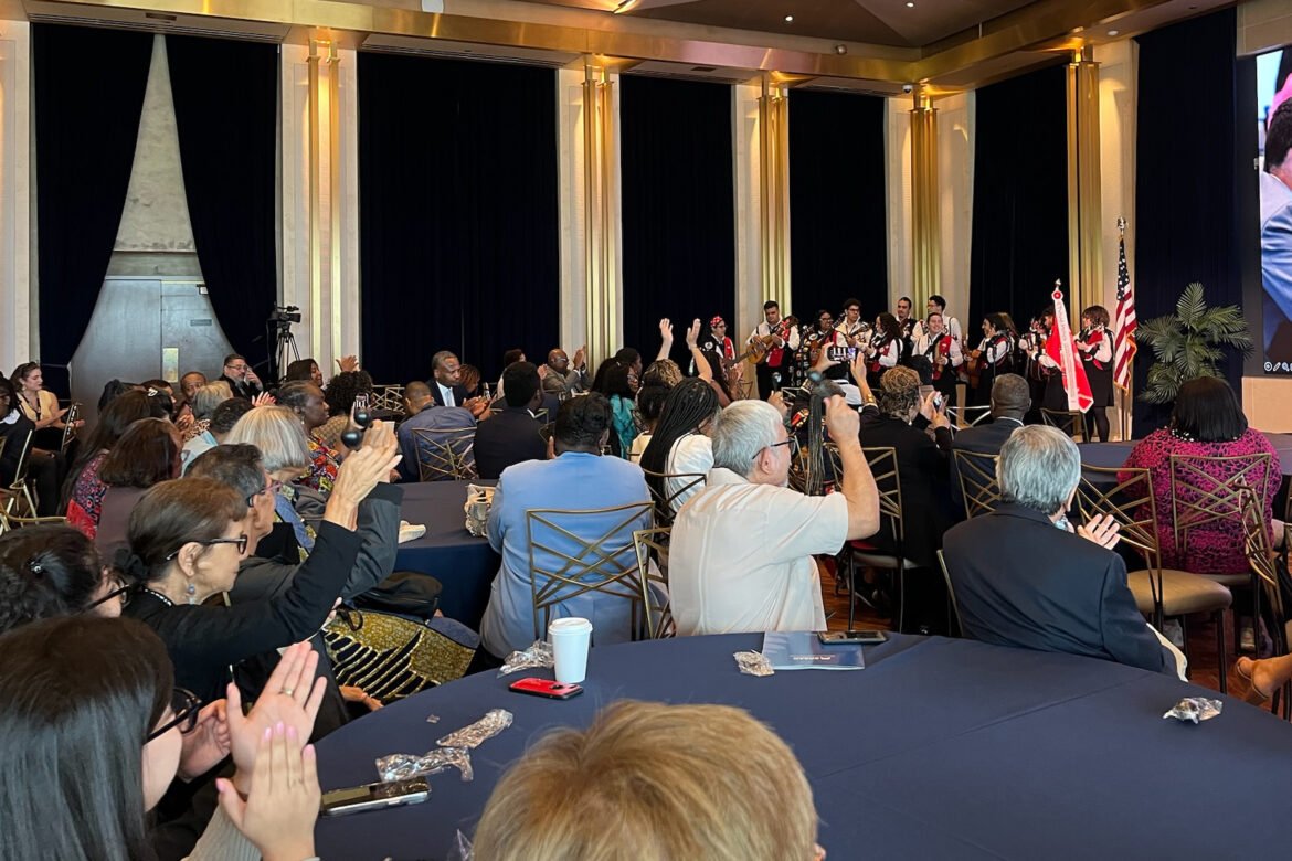 The Latino gathering included a sizable contingent of students, including the members of the University of Puerto Rico’s tuna, a type of folkloric music group traditionally made up of students facing hunger who performed in exchange for food. Today, the University of Puerto Rico’s tuna honors that history by attaching spoons to members’ costumes and by partnering with campus organizations working on hunger.
