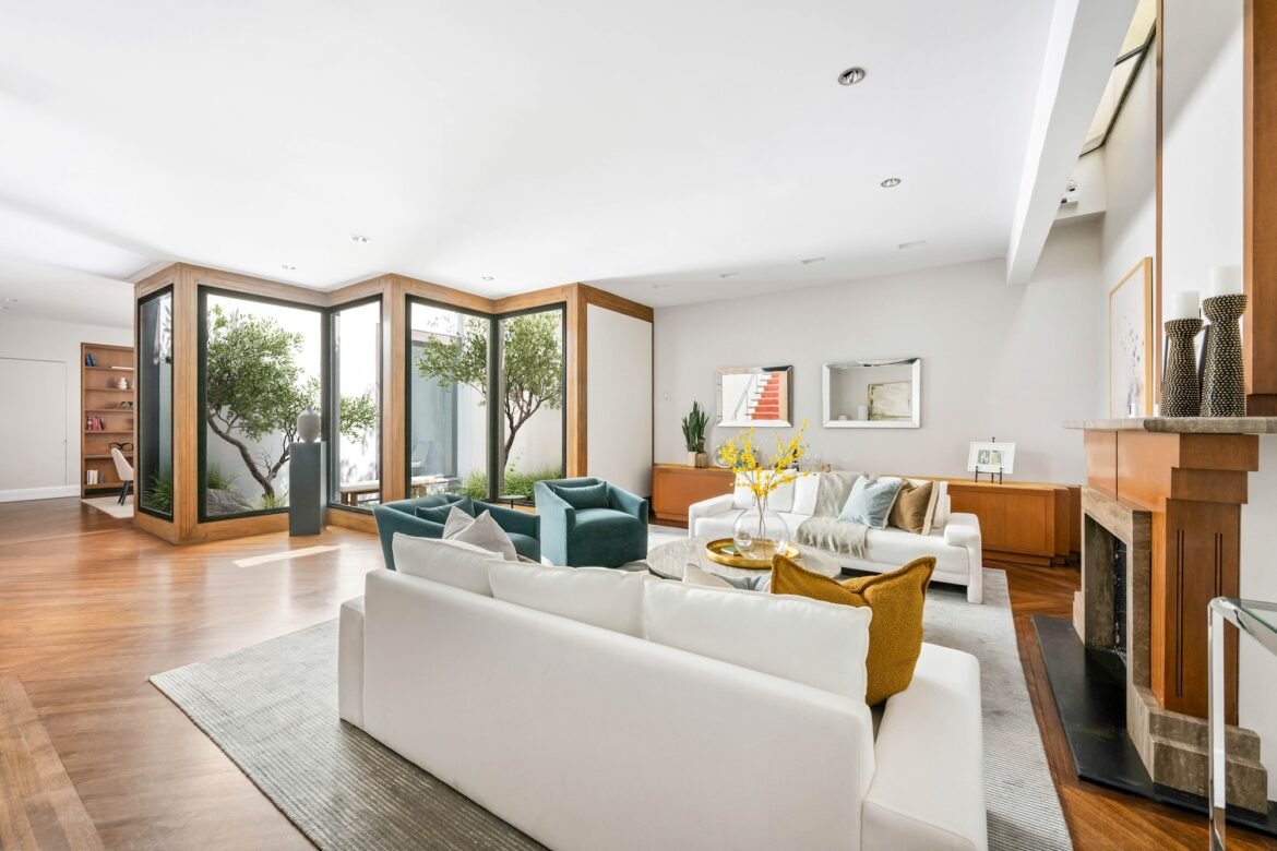 Enter the home via a private street-level entrance or through the private garage; a dramatic staircase brings you to the main living and entertaining floor. A large, open living room with a wood-burning fireplace opens onto a lovely a glass-wrapped terrace garden that brings light into the entire space.