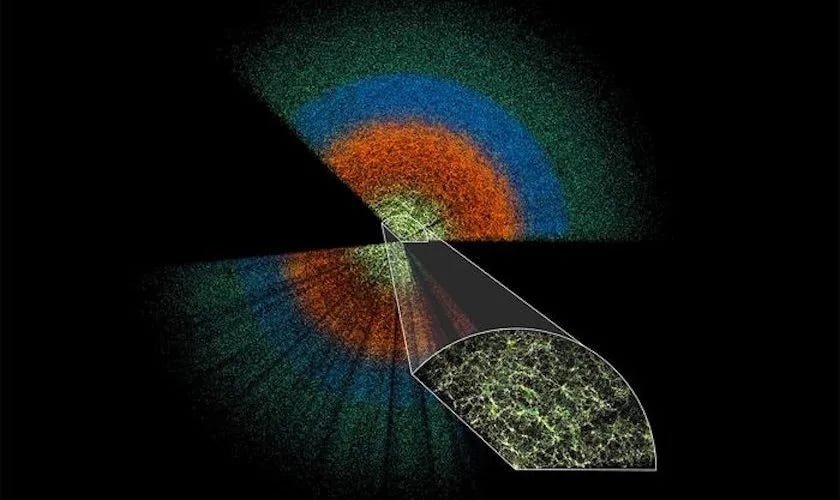 This slice of the DESI data maps celestial objects from Earth (center) to billions of light years away. Among the objects are nearby bright galaxies (yellow), luminous red galaxies (orange), emission-line galaxies (blue), and quasars (green). The large-scale structure of the universe is visible in the inset image, which shows the densest survey region and represents less than 0.1% of the DESI survey’s total volume. (Credit: Claire Lamman/DESI collaboration)
