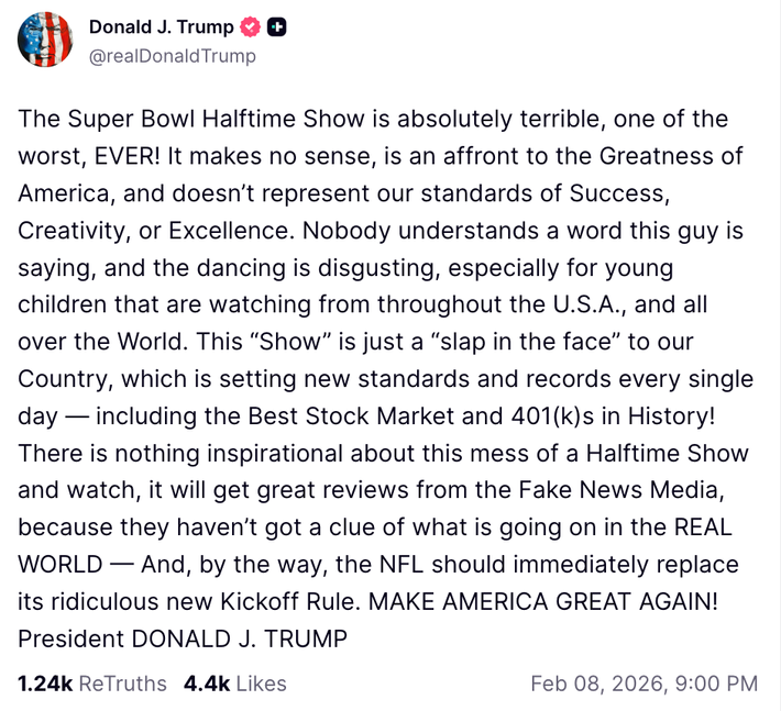 But it turns out the president would actually much prefer to watch a Bad Bunny performance and complain about it on Truth Social: