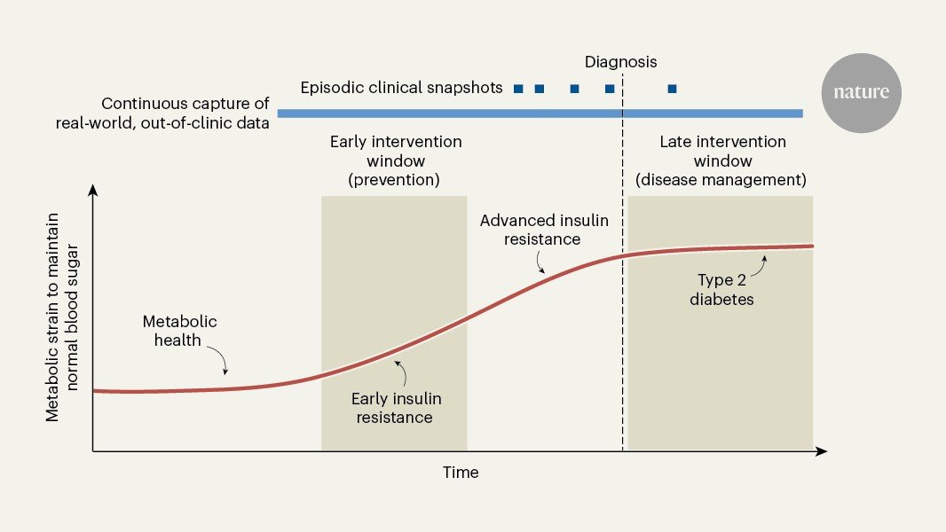 Many chronic diseases unfold slowly as continuous biological processes, yet they are typically detected through brief clinical snapshots — at annual visits to a physician or from isolated laboratory tests, for instance. Insulin resistance, a condition in which the body must work harder to regulate blood sugar, can develop for years before it becomes visible in routine diagnostics. Writing in Nature, Metwally et al.1 show that patterns in everyday-lifestyle data, collected outside the clinic from consumer wearable devices, can reveal this hidden phase earlier. Rather than a snapshot, this offers something closer to a ‘movie’ of metabolic health. By drawing on continuous signals from daily life, the authors’ approach highlights physiological strain that is invisible to episodic testing. The work raises the possibility that identifying insulin resistance — a key early feature of type 2 diabetes — earlier could enable simpler interventions and, ultimately, reduce the downstream burden of metabolic disease.