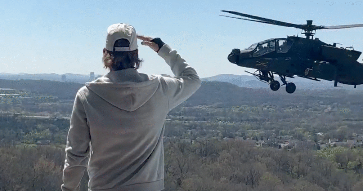 On Saturday, Kid Rock, whose real name is Robert Ritchie, shared a video that showed an AH-64 Apache attack helicopter hovering in place low across from the pool of his Tennessee home. In the clip, Ritchie can be seen standing on his patio at what almost appears to be eye level with the pilots, applauding and twice saluting them before the helicopter flies off.